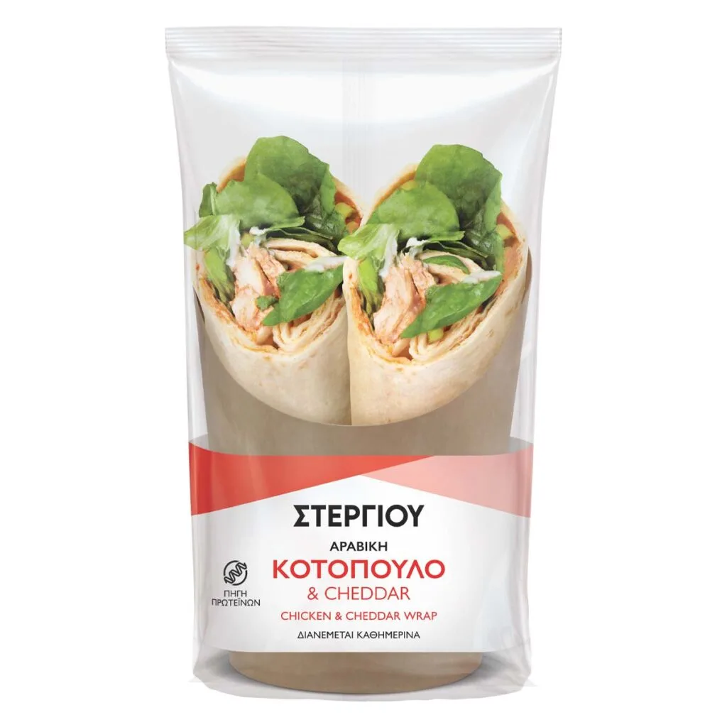 Η αραβική πίτα είναι φτιαγμένη με απλά και αγνά συστατικά, και συνδυάζεται υπέροχα με το φιλέτο από στήθος κοτόπουλου, το τυρί cheddar και την αγαπημένη σως της Οικογένεια Στεργίου.